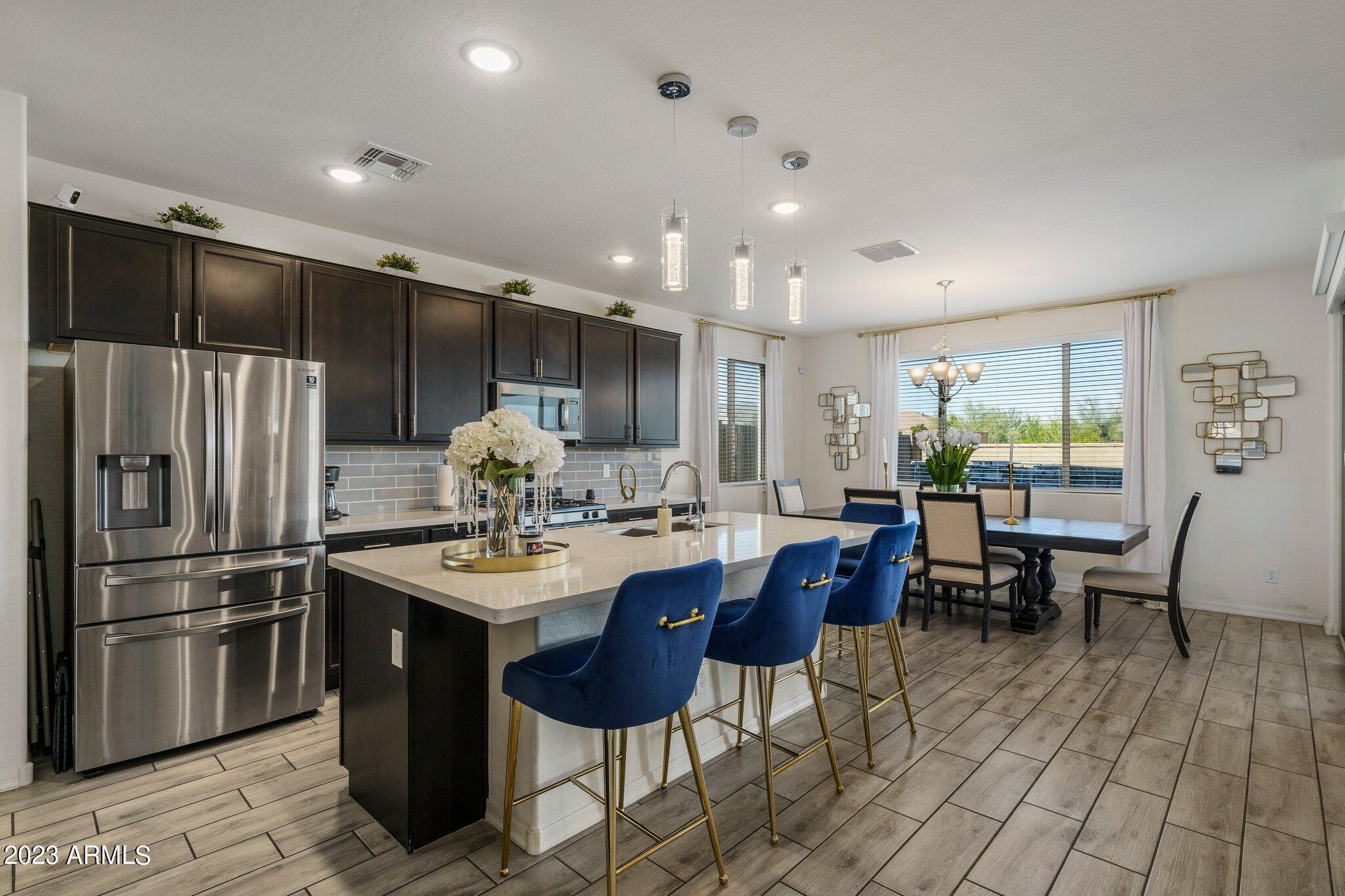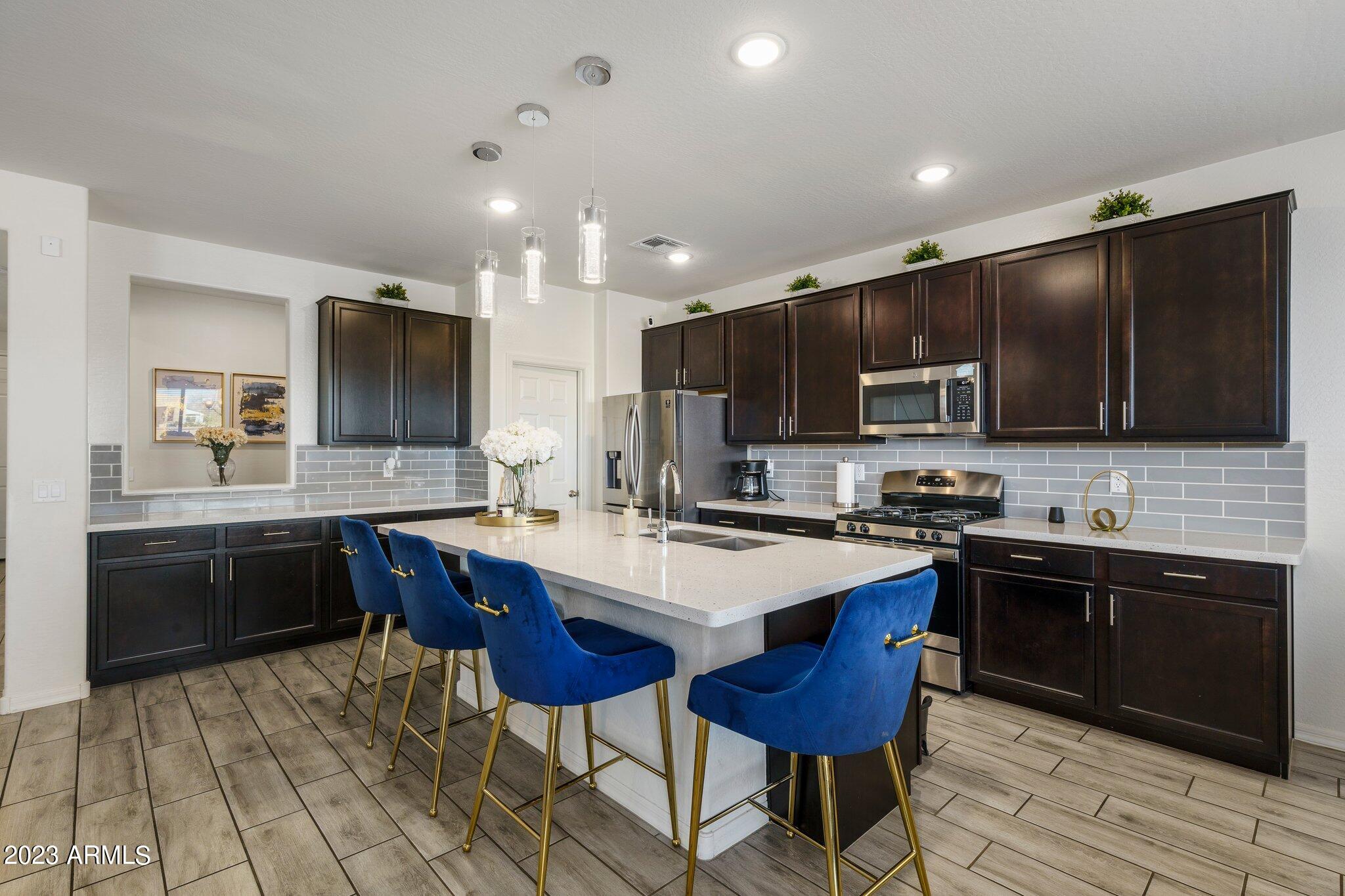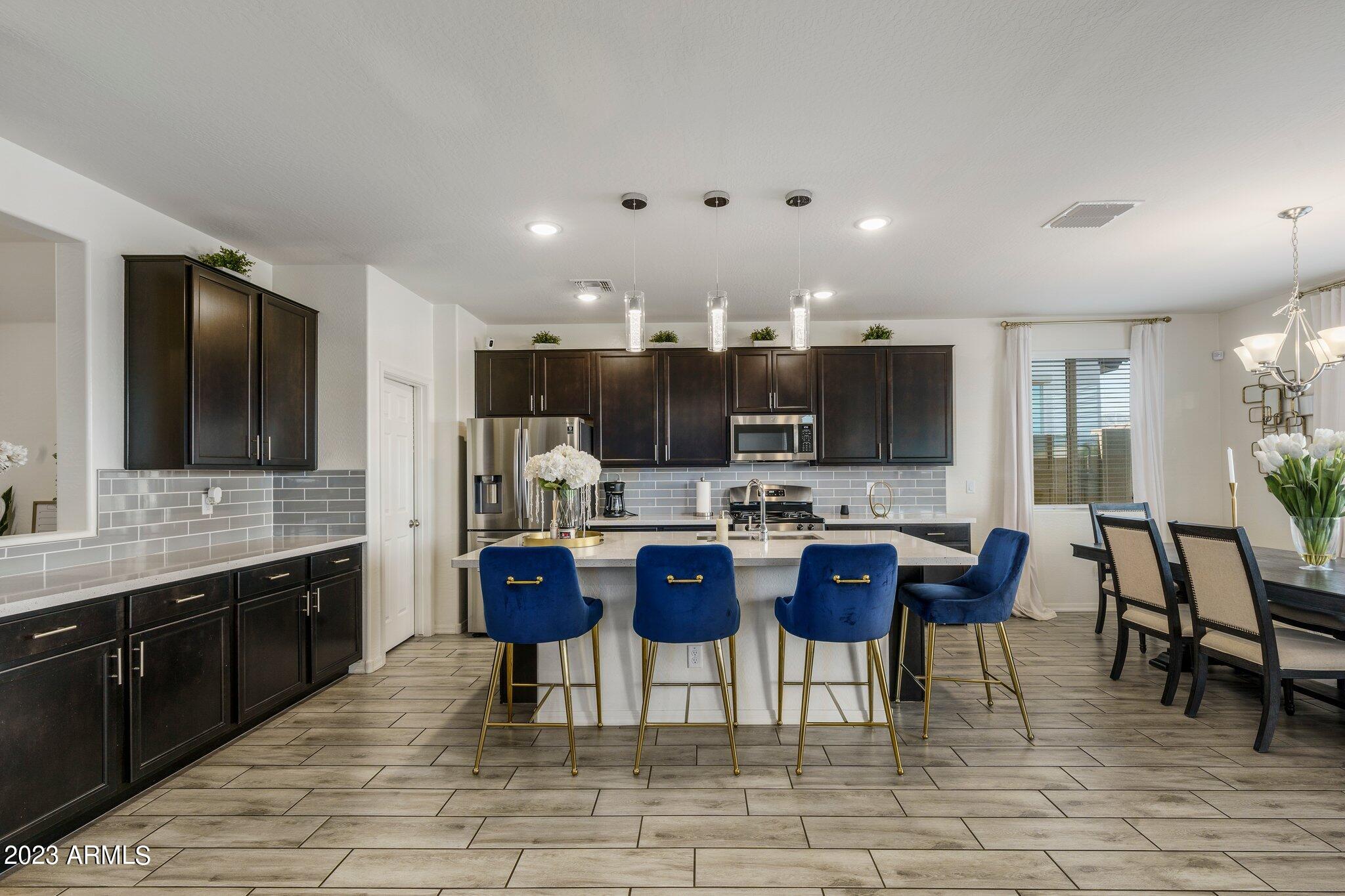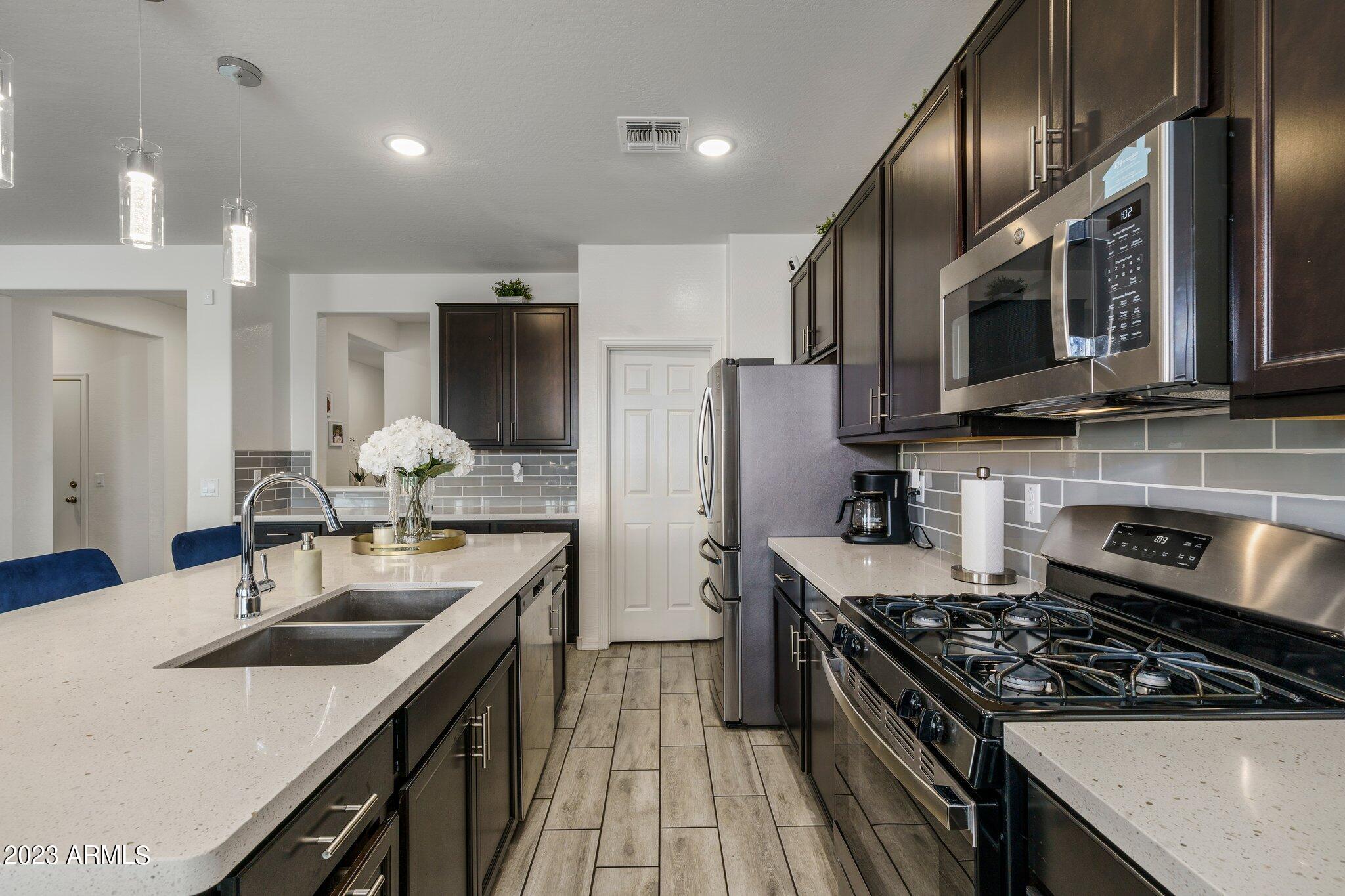 Welcome to Verrado! This turnkey K. Hovnanian home offers 5 bedrooms with a loft, 3 bathrooms and just over 2800 square feet. The color palate is beautiful and features quartz countertops, stainless appliances and wood look tile. Cooks will love the gas range, large island and walk-in pantry. The open floor plan lets in plenty of natural light and the 1st floor bed and bath would be an excellent mother-in-law suite or office. Upstairs the owners suite is spacious and open with a large walk in closet. Rounding out the top floor are the bright and airy loft, an additional 3 bedrooms and 1 bath. Out back is a nicely landscaped backyard, covered patio and beautiful mountain views. Minutes away is Verrado's Main Street with shopping, dining, the swim park, golf club, access to trails and more! and more.